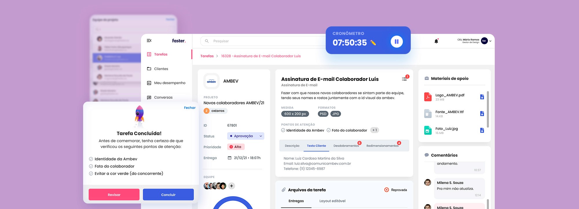 Após receber aporte, a Faster precisou priorizar o lançamento da sua plataforma oficial, que contempla um workflow de atividades de times de marketing e design. A empresa vinha esbarrando em algumas dificuldades de UX para módulos essenciais do projeto e estava enfrentando um turnover muito alto de desenvolvedores, uma vez que os colaboradores não se contextualizavam a tempo sobre todas as experimentações no roadmap de produto.